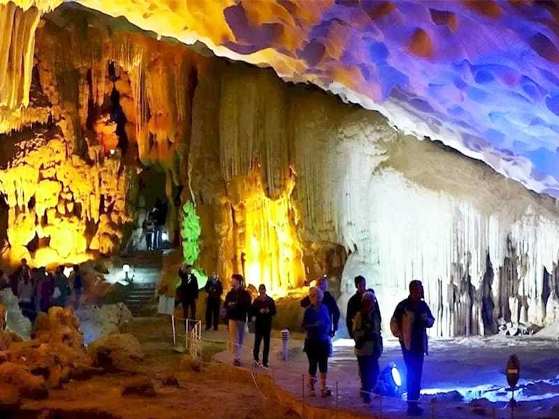 Thien Cung Cave and Sung Sot Cave are the most famous caves in Halong Bay. This name comes from the magical, glowing atmosphere created by natural light filtering through cracks in the ceiling and colorful spotlights that illuminate the shimmering stalactites.