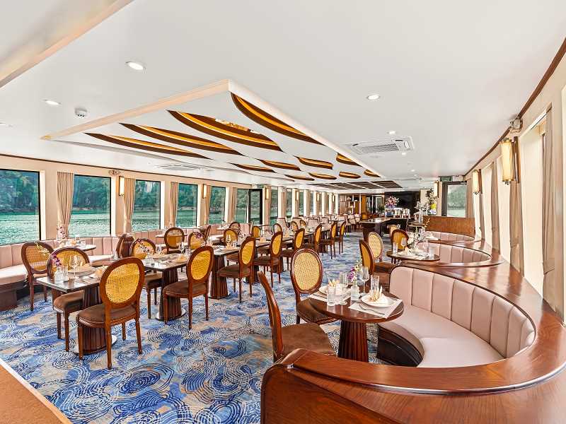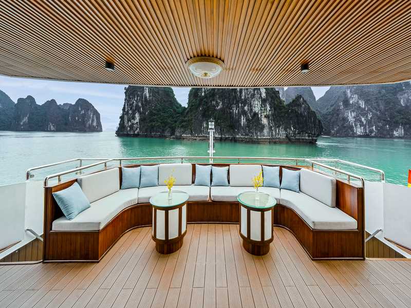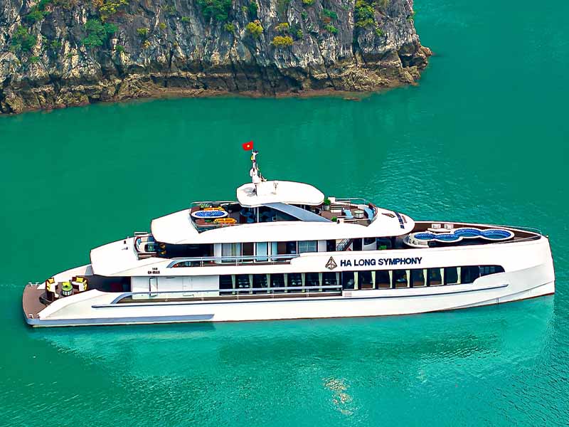 Halong Symphony Cruise is a 5-star maritime masterpiece inspired by the harmonious melodies of the wind and waves. On its refined 1-day journey through Halong Bay, guests will discover the breathtaking beauty of Sung Sot Cave, Luon Cave, and Titop Island. Featuring a sophisticated contemporary design in elegant deep blue. This luxury day cruise offers unique amenities such as a dual-Jacuzzi system, private day-use rooms, and a grand dining hall serving a lavish seafood buffet.